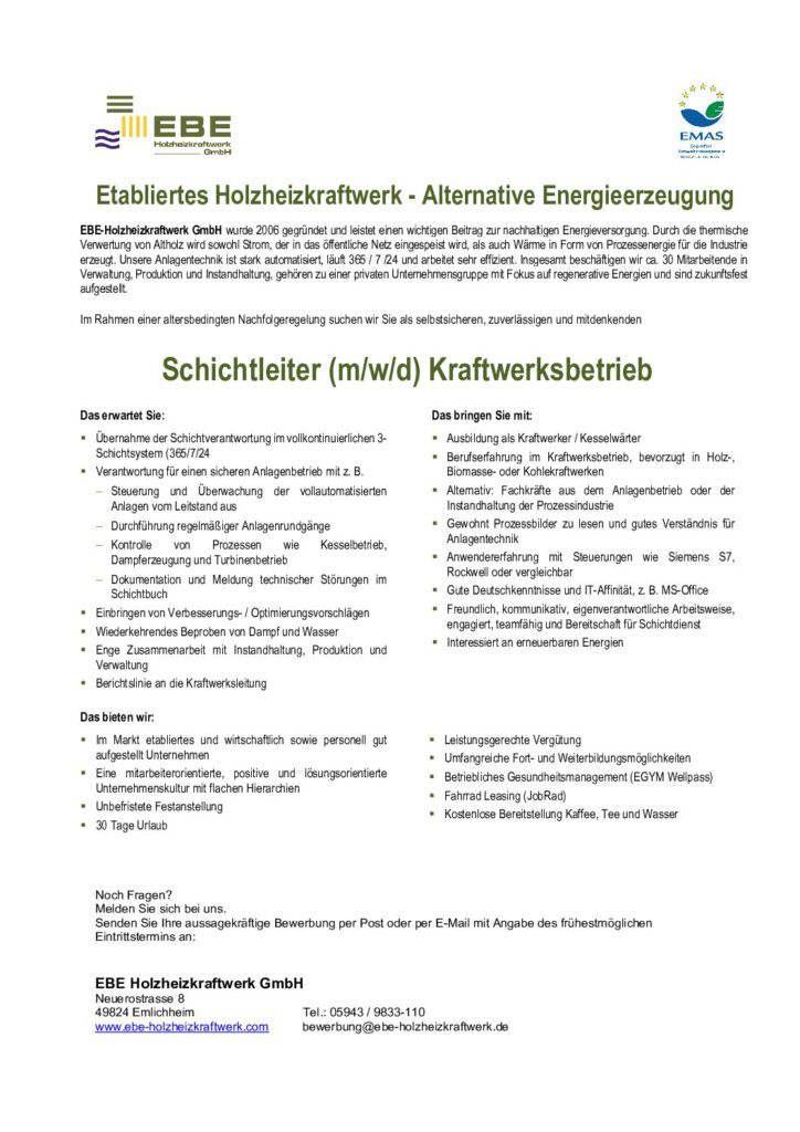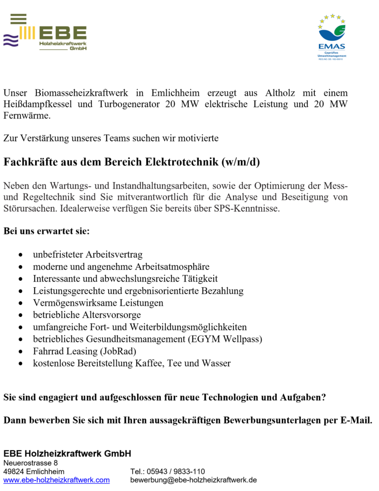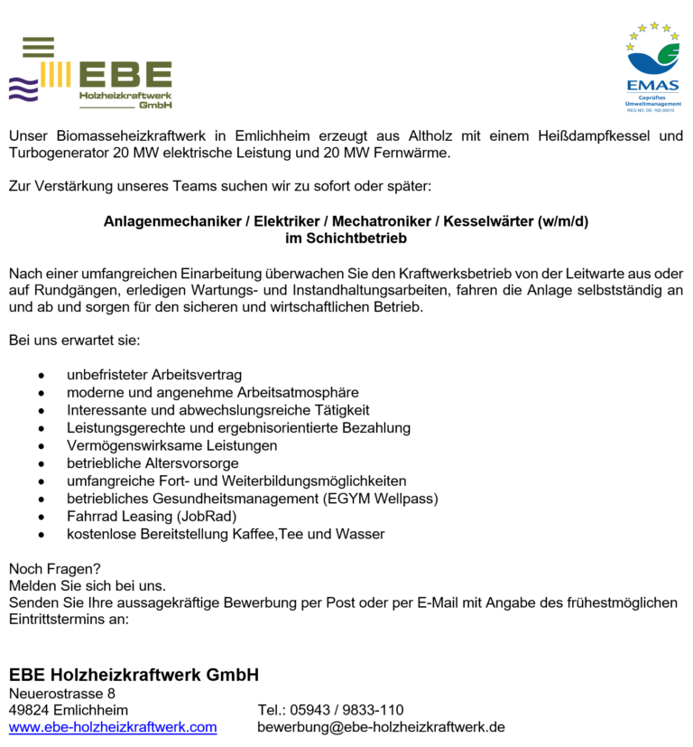 EBE Holzheizkraftwerk GmbHNeuerostraße 849824 Emlichheimbewerbung@ebe-holzheizkraftwerk.de